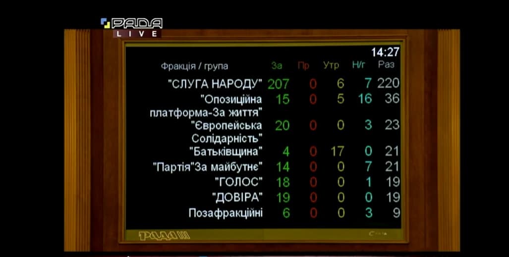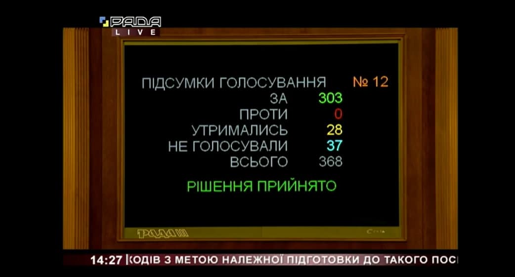 За документ проголосовали 303 парламентария, из них 207 с фракции "Слуга народа", никто из нардепов не голосовал против постановления.