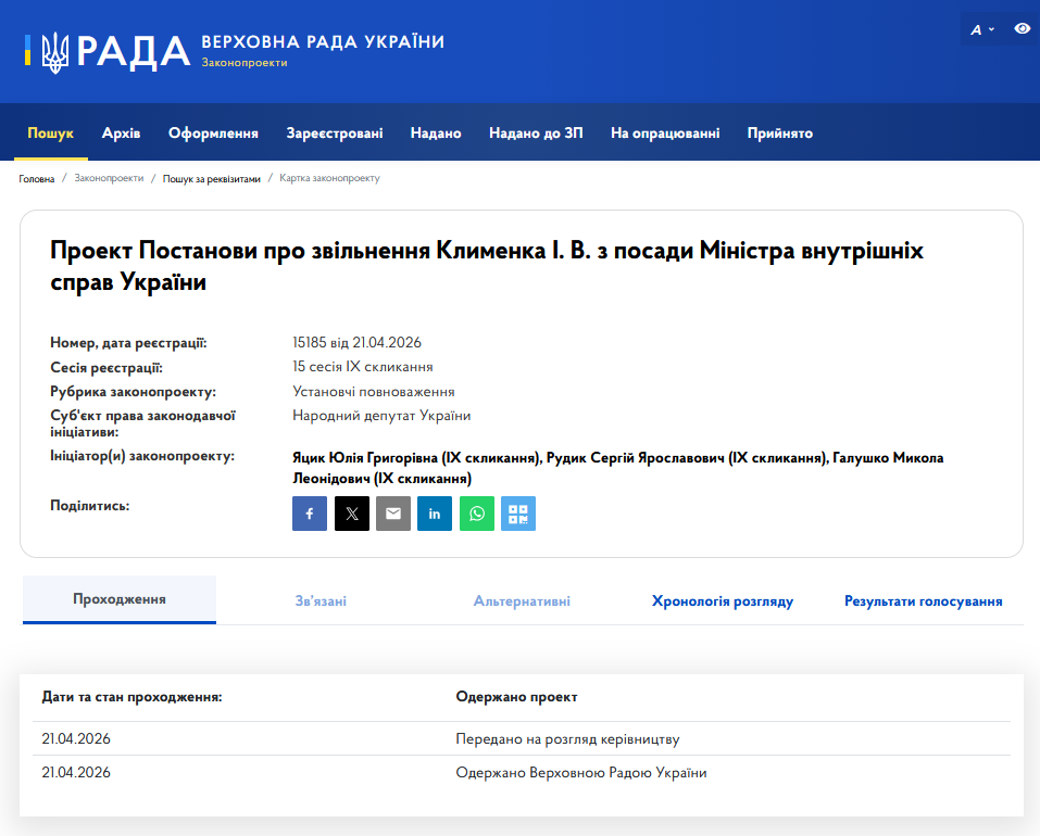 Как отмечается на портале Верховной Рады, проект постановления №15185 "Об увольнении Клименко И. В. с должности Министра внутренних дел Украины" от 21 апреля 2026 года зарегистрировали несколько народных депутатов. А именно: нардеп IX созыва Юлия Яцик (внефракционная), Сергей Рудык (депутатская группа "Партия "За будущее") и Николай Галушко (фракция "Слуга народа").