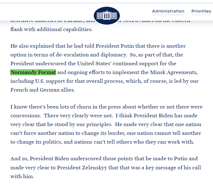 В официальном заявлении Белого дома говорится, что американская администрация поддерживает "нормандский формат" и не собирается рассматривать другие форматы урегулирования ситуации на Донбассе.
