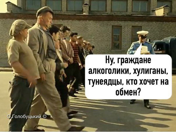 На карикатуре можно увидеть героев известного фильма - "Операция "Ы" и другие приключения Шурика", на которой упоминается всем известная фраза: "Ну, граждане алкоголики, тунеядцы, хулиганы кто хочет поработать". Правда теперь, в контексте прошедшего обмена пленными, она звучит иначе, но более чем актуально.