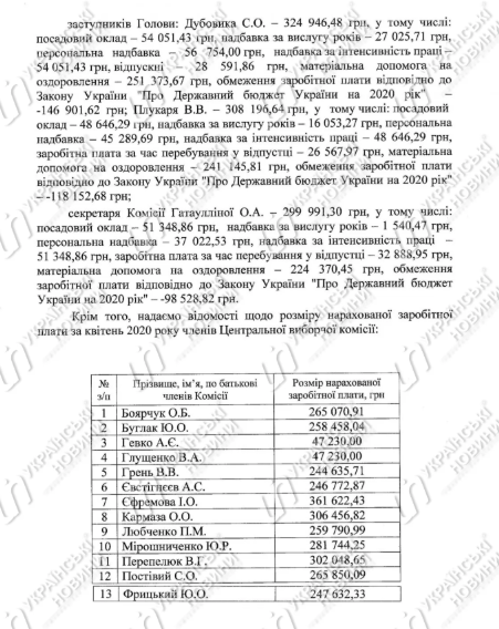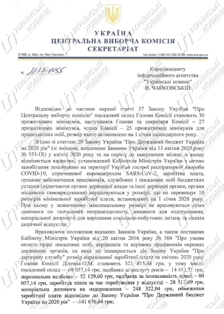 Зарплата руководства ЦИК за апрель уменьшилась примерно на 30% до 300-325 тыс. гривен, хотя президент Зеленский обещал, что зарплаты чиновников будут ограничены и составят максимум 47 тыс. гривен в месяц.