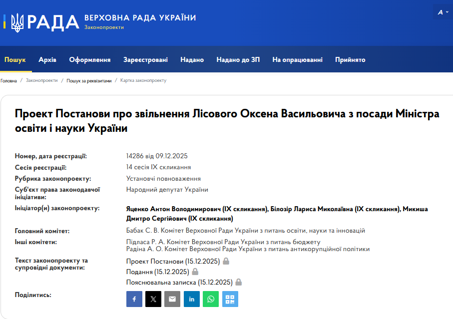 В частности, инициаторы (народные депутаты Антон Яценко, Лариса Билозир и Дмитрий Микиша) заявили об управленческой неэффективности и нарушениях в финансовой отчетности Министерства образования.