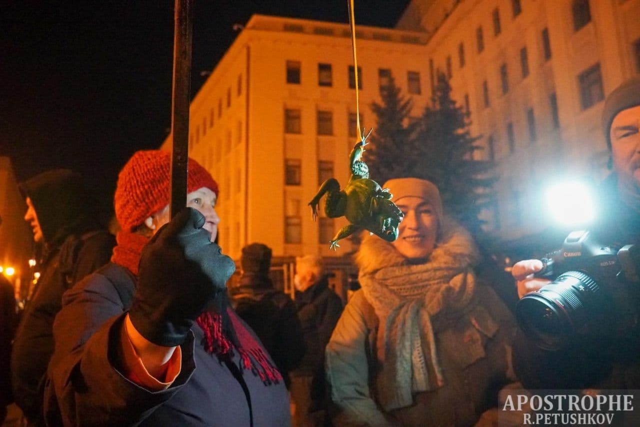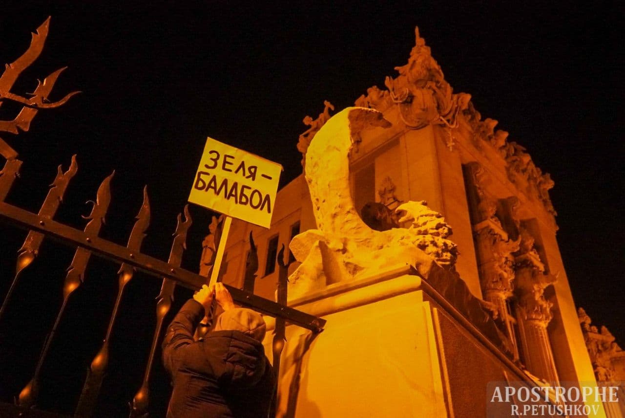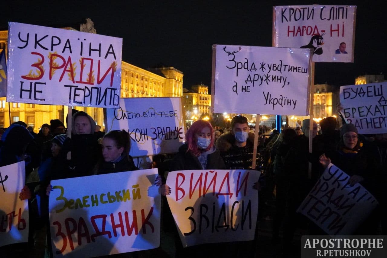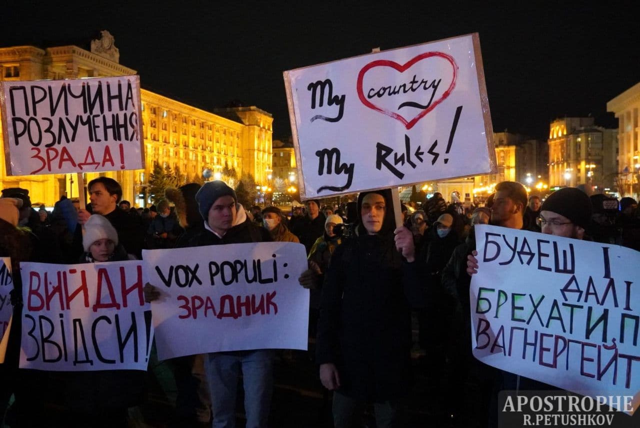 19:00 Участники акции пришли с плакатами, в которых обвиняют представителей власти в предательстве интересов Украины.