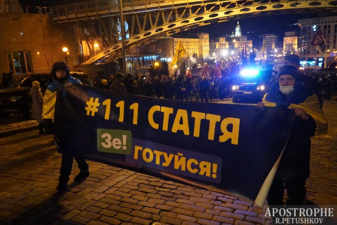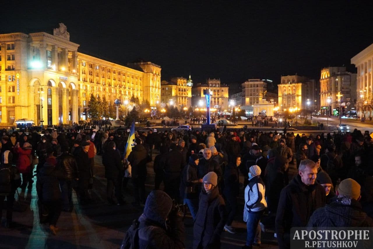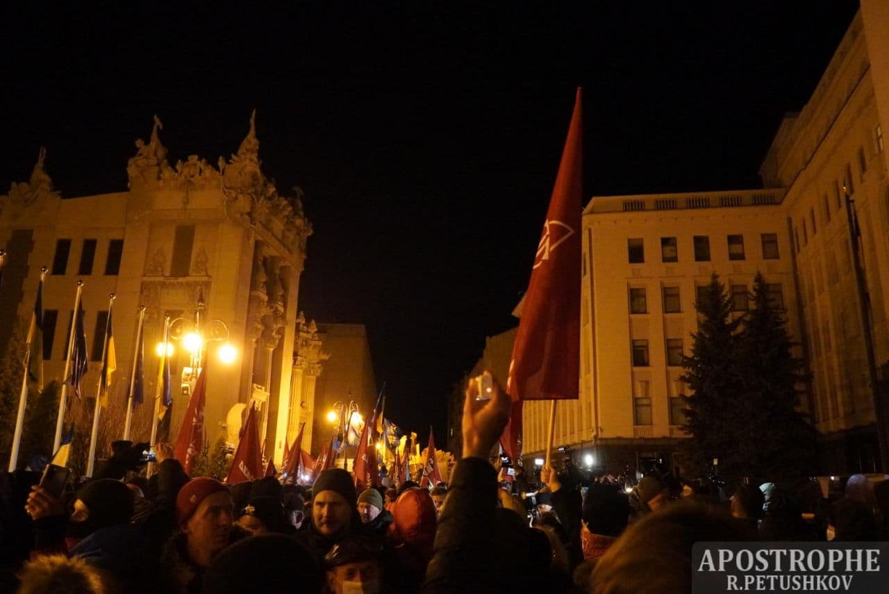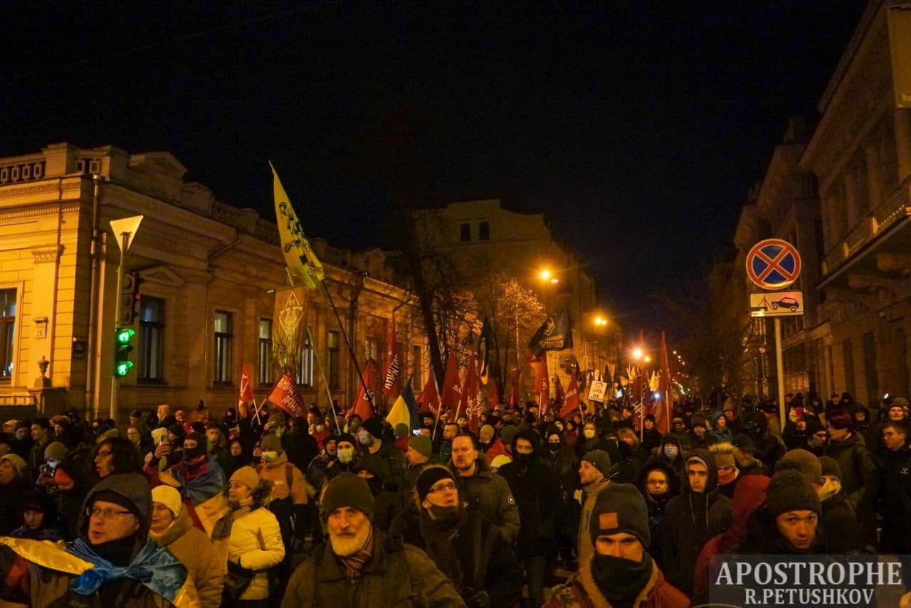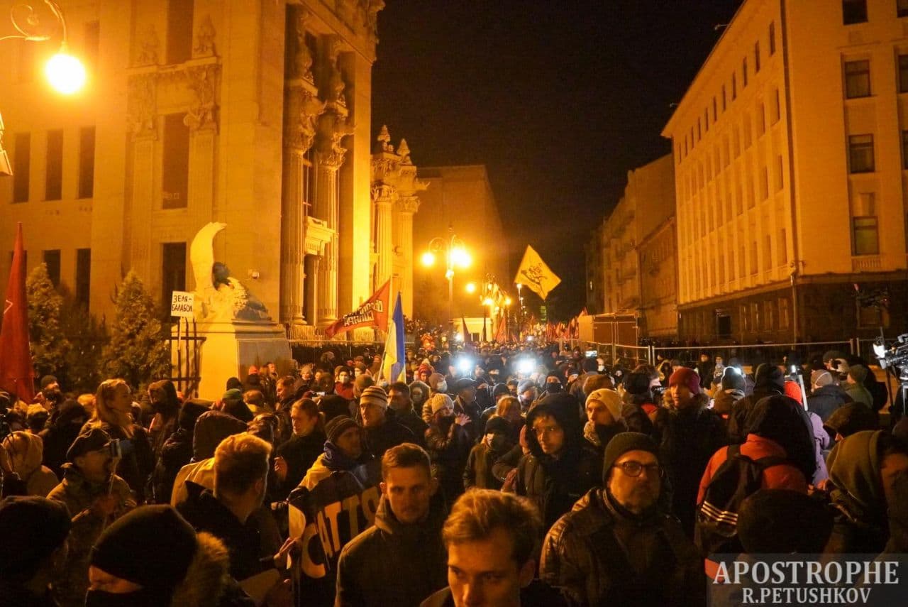20:05 В течение часа число участников вече возросло до полутора тысяч. Один з основателей партии "Демсокира" Юрий Гудименко с трибуны потребовал отставки президента Владимира Зеленского, после чего участники акции начали формировать колонну для шествия по Институтской в сторону Офиса президента на Банковой.