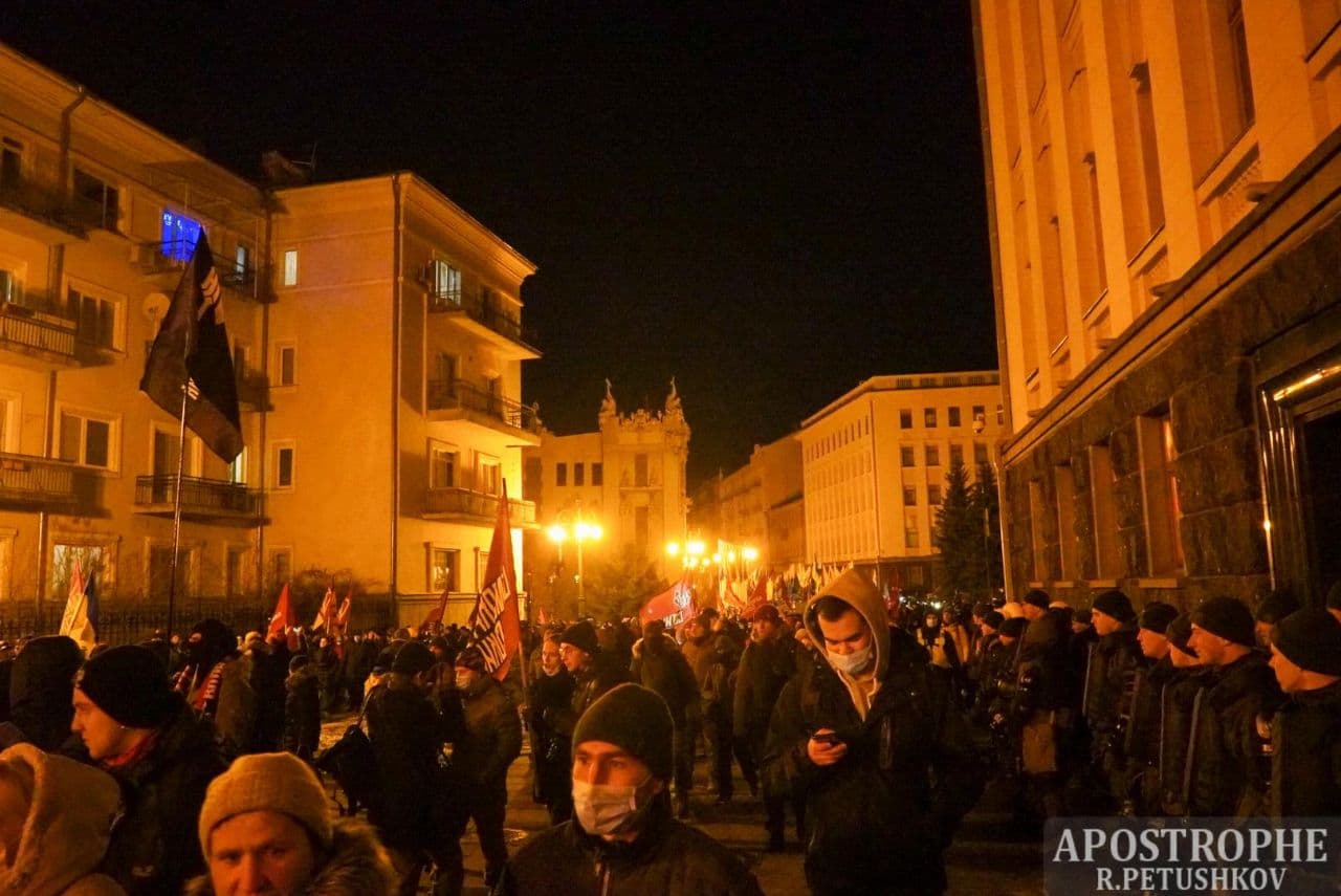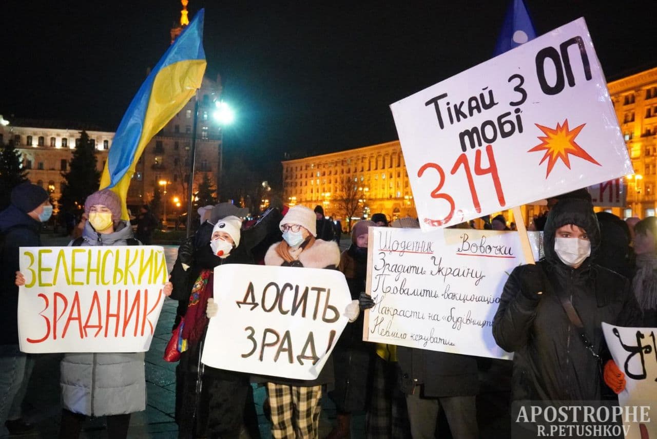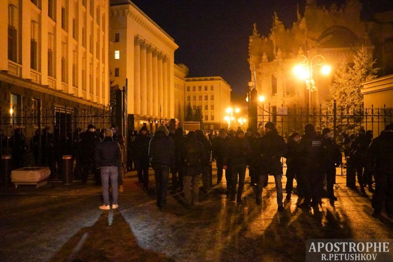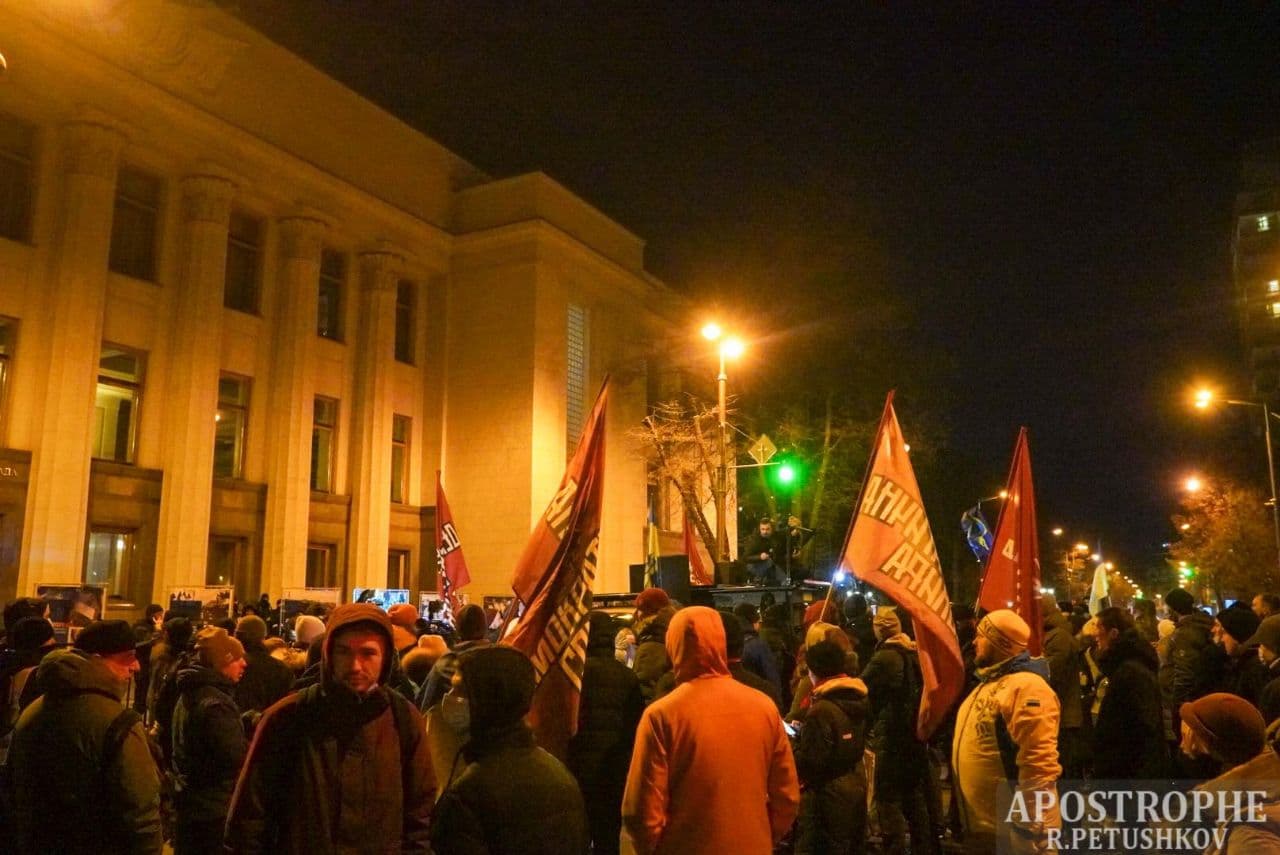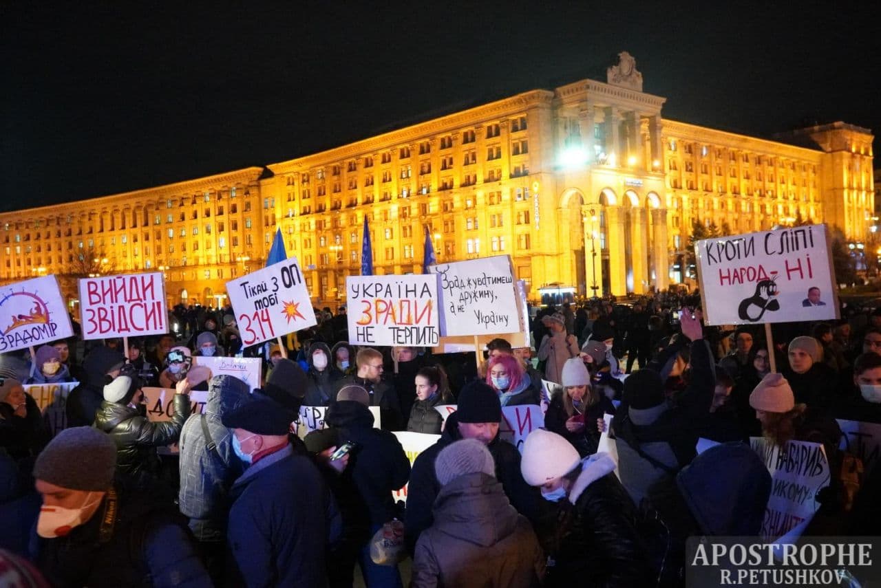 20:05 В течение часа число участников вече возросло до полутора тысяч. Один з основателей партии "Демсокира" Юрий Гудименко с трибуны потребовал отставки президента Владимира Зеленского, после чего участники акции начали формировать колонну для шествия по Институтской в сторону Офиса президента на Банковой.