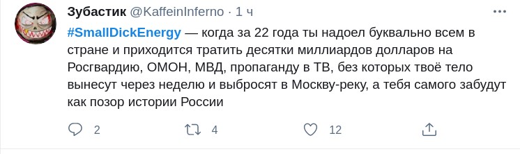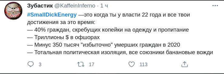 В сообщении работники российского посольства использовали выражение Small Dick Energy, что можно буквально перевести как "энергетика маленького пен**а". Это выражение применяют по отношению к тем, кто показывает свою дерзость и самоуверенность, хотя на самом деле ничего из себя не представляет. Примечательно, что твит был удален спустя несколько минут, но его успели заскринить и опубликовать в Сети.