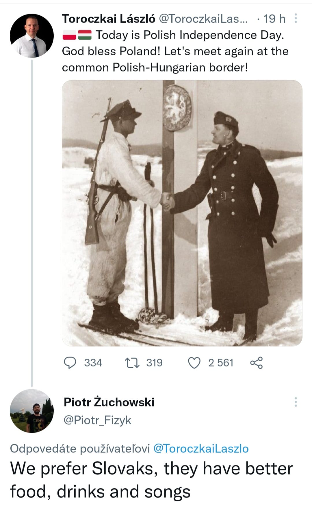 Репортер словацкого издания Denník N Томаш Форро также отметил на своей странице в Facebook, что реакция поляков на данный твит не заставила себя долго ждать. На скриншоте ответа на данный пост Торочкая один из поляков написал, что они "предпочитают больше Словакию, так как у них лучше еда, напитки и песни".