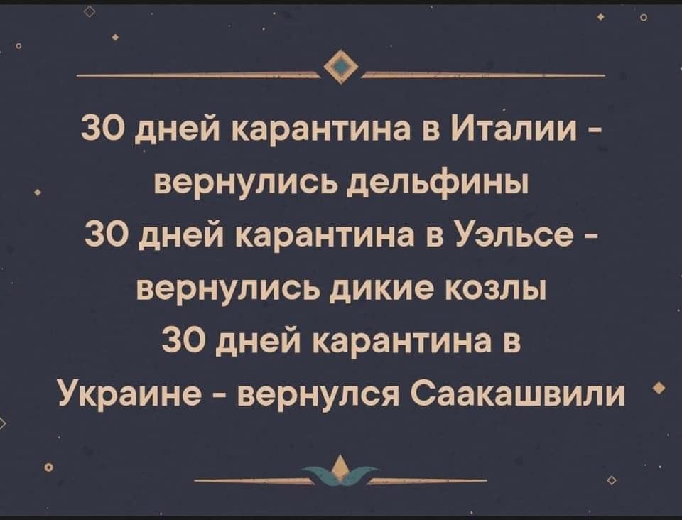 "30 дней карантина в Италии – вернулись дельфины. 30 дней карантина в Уэльсе – вернулись дикие козлы. 30 дней карантина в Украине – вернулся Саакашвили", - гласит надпись.