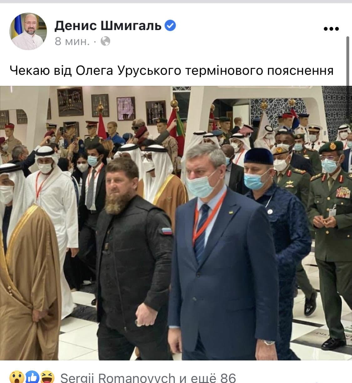 После обнародования фото Уруского рядом с Кадыровым премьер-министр Украины Денис Шмыгаль потребовал от Уруского объяснений, написав об этом на стоите странице в Facebook.