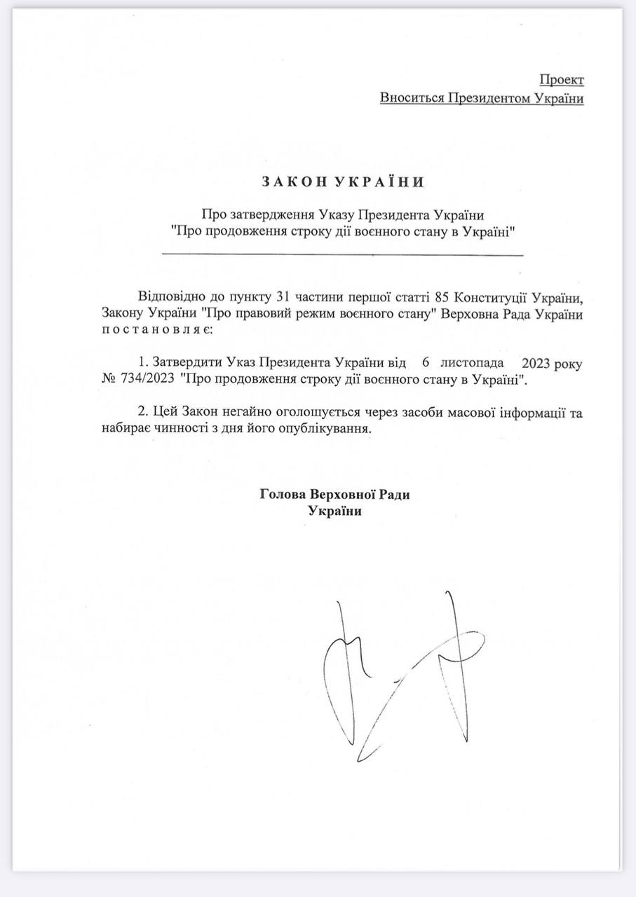 Проектами законов предлагается утвердить указы президента о продлении с 5 часов 30 минут 16 ноября 2023 года срок действия военного положения в Украине на 90 суток и продлении всеобщей мобилизации с 16 ноября на 90 суток.