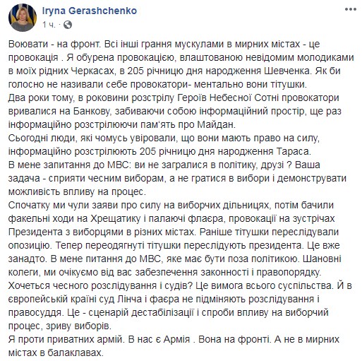 "Воевать - на фронт. Все остальное поигрывание мускулами в мирных городах - это провокация. Я возмущена провокацией, устроенной неизвестным молодыми в моих родных Черкассах, в 205 годовщину со дня рождения Шевченко. Как бы громко ни называли себя провокаторы - ментально они титушки", - написала политик.