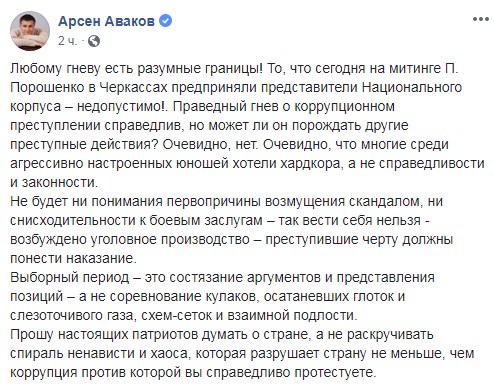 "Не будет ни понимания первопричины возмущения скандалом, ни снисходительности к боевым заслугам – так вести себя нельзя - возбуждено уголовное производство – преступившие черту должны понести наказание", - написал он в Facebook.