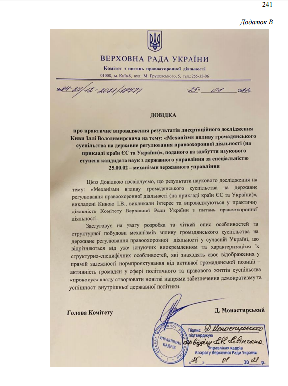 Народный депутат от "Слуги народа", глава правоохранительного комитета ВРУ Денис Монастырский, который может возглавить МВД вместо Арсена Авакова, подписал нардепу от "ОПЗЖ" Илье Киве справку о практическом применении его научной диссертации.