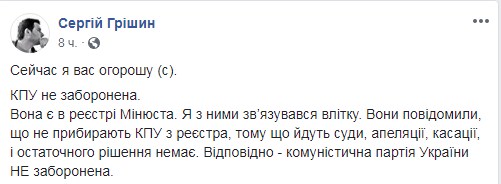 Позже в Министерстве юстиции Украины сообщили, что пока решение суда о запрете не вступило в силу, Компартия может продолжать свою деятельность.