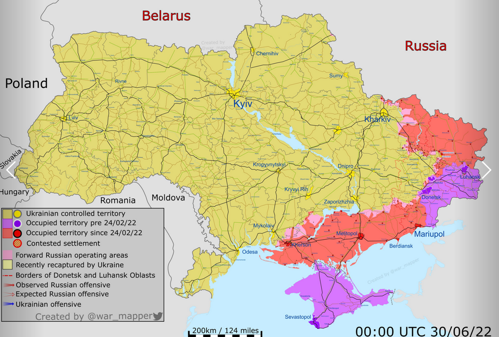 Российские оккупанты продолжают обстреливать позиции ВСУ в районе Лисичанска. Ведут штурм в районе Лисичанского нефтеперерабатывающего завода, имея частичный успех. Сейчас враг удерживает северо-западную и юго-восточную части НПЗ.