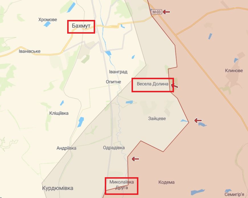 на Бахмутском направлении – Северск, Раздолевка, Соледар, Бахмутское, Бахмут, Веселая Долина, Нью-Йорк, Юрьевка, Розовка и Зайцево;
