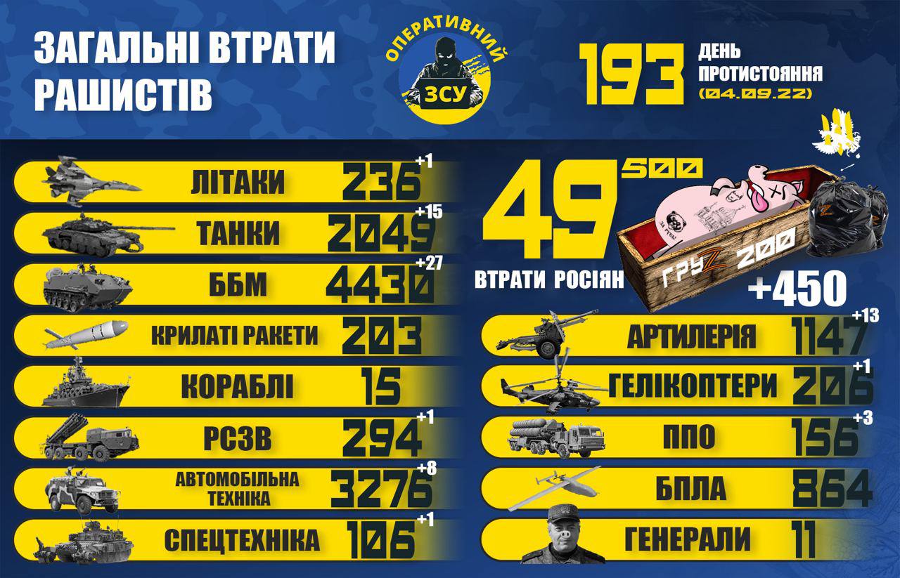 09:10 За прошлые сутки, 3 сентября, ВСУ уничтожили 450 оккупантов, 15 танков и 27 бронемашин врага.