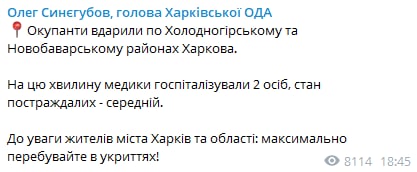 18:59 Российские оккупанты снова обстреляли Харьков. Под огнем оказались частный сектор Холодногорского и Новобаварского районов. По предварительным данным, два человека оказались в больнице с ранениями.