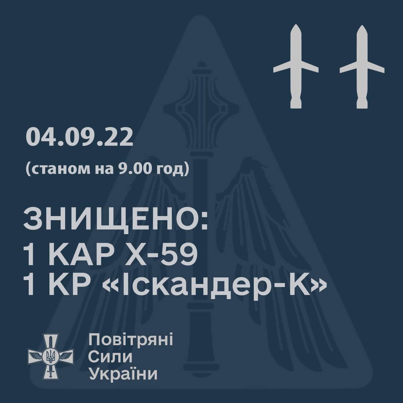13:10 С начала суток 4 сентября было выпущено более десяти ракет, две из которых - Х-59 и предположительно "Искандер-К" были уничтожены силами и средствами противовоздушной обороны ПС ВСУ. Кроме того, противник продолжает использовать зенитные ракеты С-300, обстреливая прифронтовую зону, в частности гражданские объекты в областных центрах.