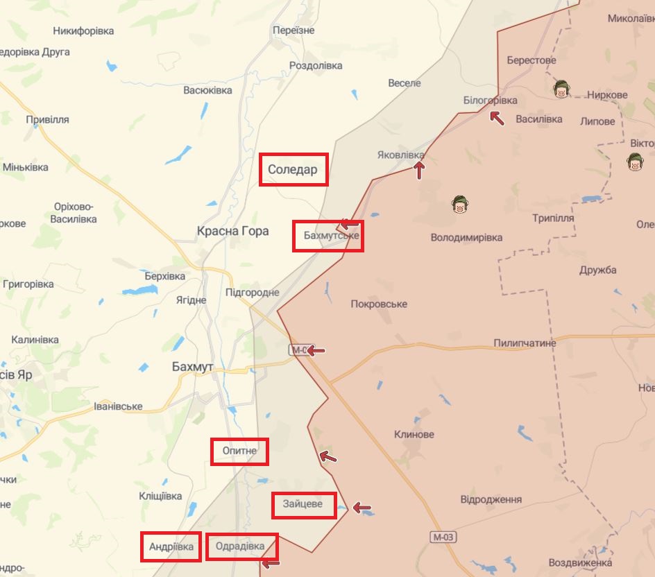 на Бахмутском направлении – Выемка, Яковлевка, Соледаь, Бахмутское, Бахмут, Веселая Долина, Одрадовка и Зайцево;