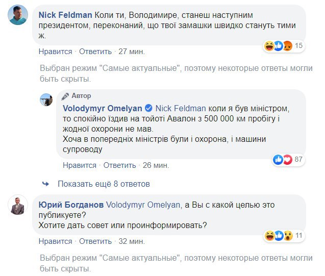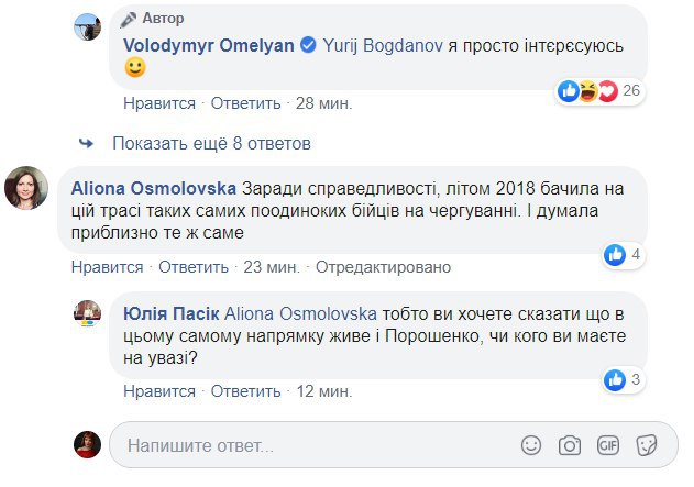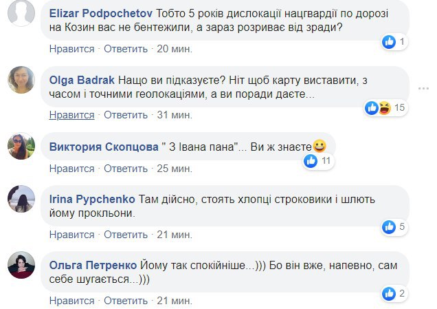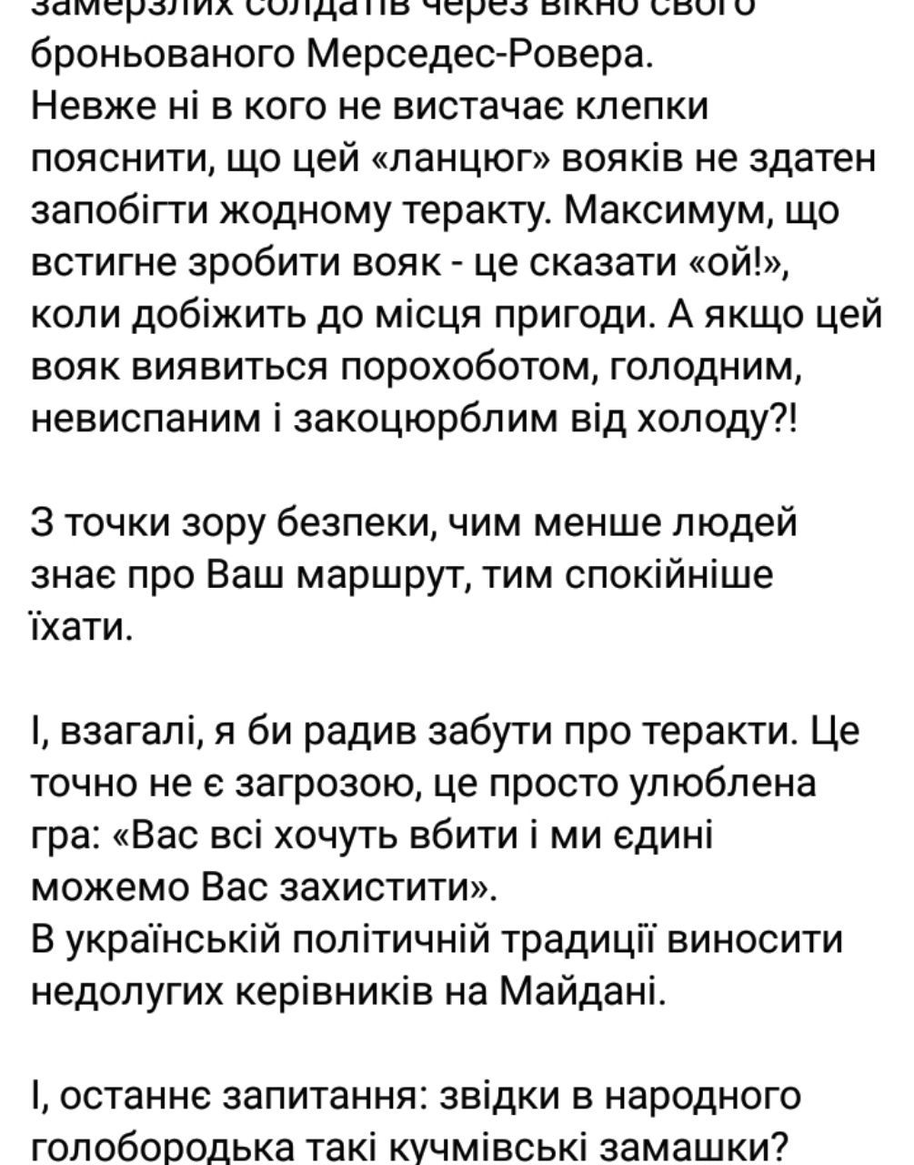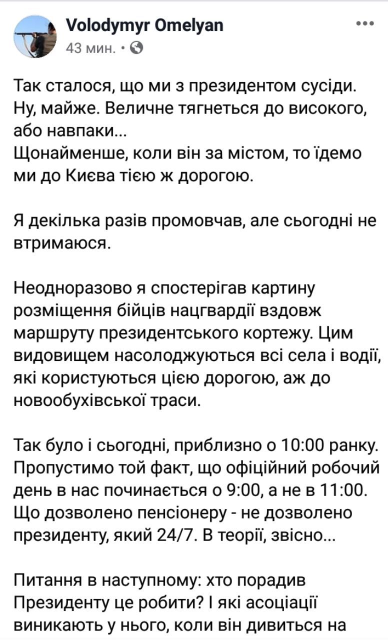 "Неоднократно я наблюдал картину размещения бойцов Нацгвардии вдоль маршрута президентского кортежа. Этим зрелищем наслаждаются все села и водители, которые пользуются этой дорогой, до Новообуховской трассы. Вопрос в следующем: кто посоветовал Президенту это делать? И какие ассоциации возникают у него, когда он смотрит на замерзших солдат через окно своего бронированного Мерседес-Ровера. Неужели ни у кого не хватает мозгов объяснить, что эта "цепь" воинов не способна предотвратить ни один теракт. Максимум, что успеет сделать солдат - это сказать " ой! ", когда добежит до места происшествия", - написал Владимир Омелян.