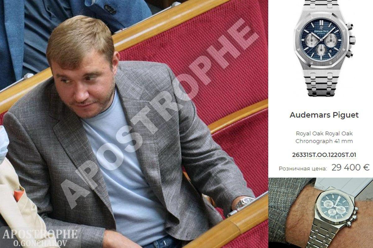 Депутат ОПЗЖ Игорь Кисилев пришел в Раду с часами, похожими на часы швейцарской марки Audemars Piguet. Цена таких часов составляет 29 тысяч 400 евро. В переводе на украинскую валюту это 952 тысячи гривен.