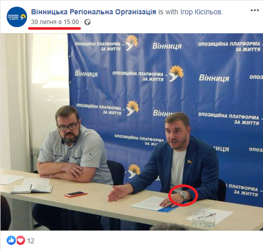 Разумеется, можно было бы предположить, что народный избранник купил часы совсем недавно и еще не успел внести их в декларацию, закон дает на внесение изменений 10 дней. Но на странице депутата в Facebook мы видим, что депутат носил эти же часы еще 30 июля.