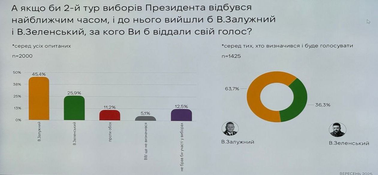 Во втором туре избирательной гонки за Залужного проголосовали бы 63,7% опрошенных. В то же время, за Зеленского отдали бы 36,3% голосов.