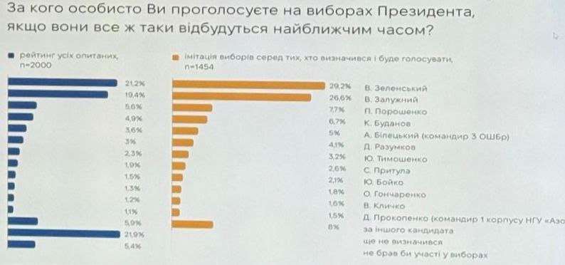 Согласно обнародованным данным, в целом в выборах президента, если бы состоялись в ближайшее время, в первом туре украинцы бы больше всего голосов отдали Зеленскому и Залужному (29,2% и 26,6% соответственно).