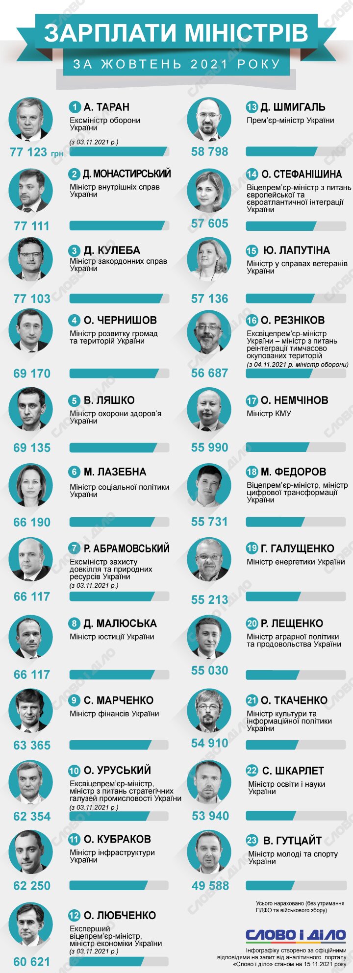 В то же время премьер-министр Денис Шмыгаль получил 58 тысяч 798 гривен. Самая маленькая зарплата в октябре была у министра спорта Вадима Гутцайта - 49 тысяч 588 гривен. Заработная плата остальных министров за октябрь колеблется в пределах 53-69 тысяч гривен.