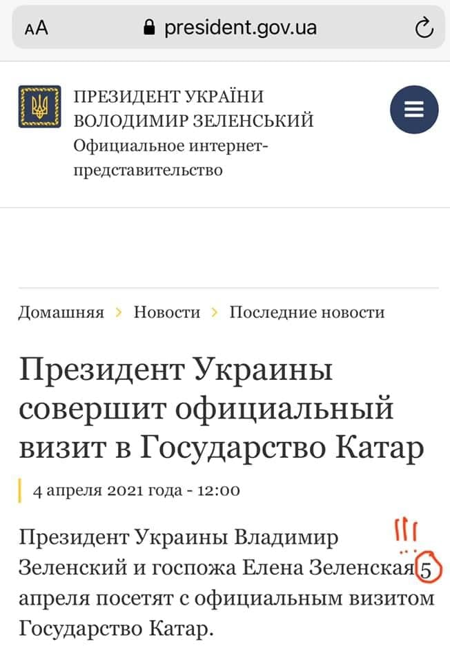 В сообщении сказано, что украинский президент и его супруга Елена Зеленская прилетели на самолеты в Катар 4 апреля. Владимир Александрович проведет встречу с эмиром Катара шейхом Тамимом бин Хамадом Аль Тани и представителей Министерства внутренних дел страны Халидом бен Халифой аль Тани. Также президент подпишет несколько важных документов.