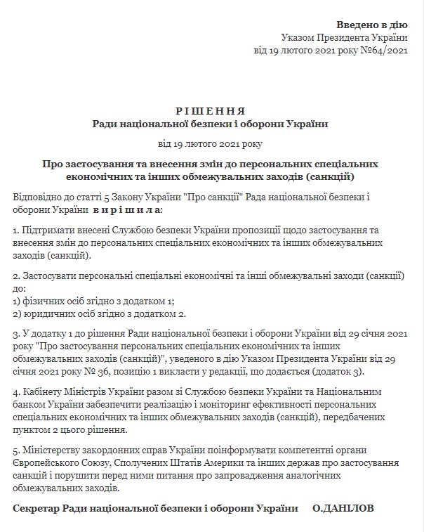 В документе, который был подписан украинским президентом сказано о блокировании активов, ограничении торговых операций, приостановлении исполнения экономических и финансовых обязательств. Также Виктору Медведчуку и всем, кто попал в санкционный список, утвержденный президентом Украины, аннулировали лицензию на пользование недрами. Запрещается транзит ресурсов по всей стране и вывод капиталов за рубеж.