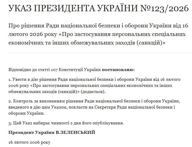 Речь идет об указе №123/2026, которым введено в действие решение Совета национальной безопасности и обороны.