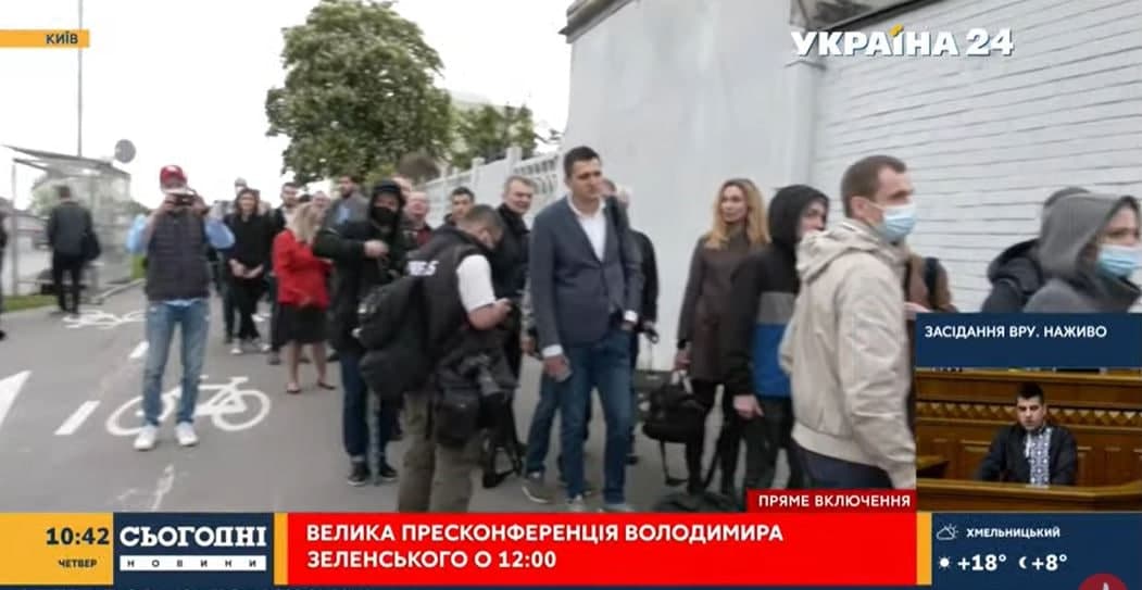 10:47 Журналистов начали пускать на завод "Антонов", где пройдет пресс-конференция Зеленского. В очереди стоят не менее сотни представителей СМИ, их тщательно проверяют на входе.