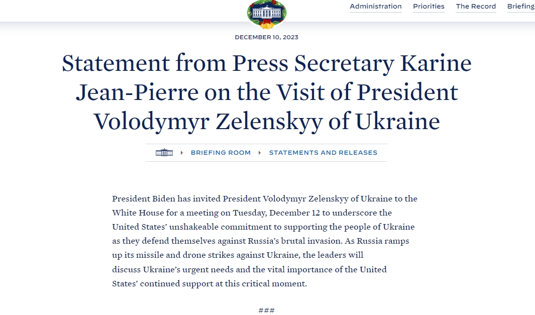 "Чтобы подчеркнуть непреклонную преданность Соединенных Штатов поддержке народа Украины, который защищается от жестокого вторжения России. В то время, как Россия наращивает свои ракетные и беспилотные удары по Украине, лидеры обсудят срочные потребности и жизненно важную необходимость дальнейшей поддержки Соединенных Штатов в этот критический для Украины момент", - отметили в пресс-службе.
