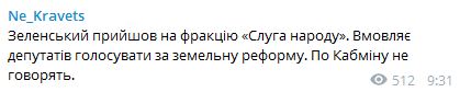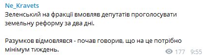 "Зеленский на фракции уговаривал депутатов проголосовать земельную реформу за два дня. Разумков отказывался - начал говорил, что на это нужно минимум неделю", - сообщил журналист.