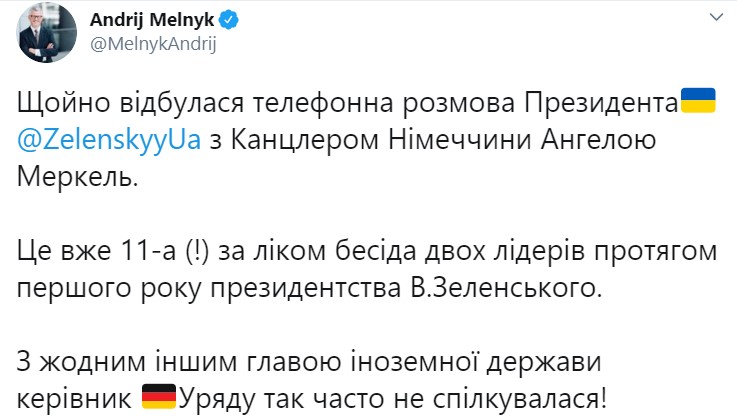 "Только что состоялся телефонный разговор Президента с Канцлером Германии Ангелой Меркель. Это уже одиннадцатый по счету разговор двух лидеров в течение первого года президентства В.Зеленского. Ни с каким другим главой иностранного государства руководитель немецкого правительства так часто не общалась", - написал дипломат Андрей Мельник.