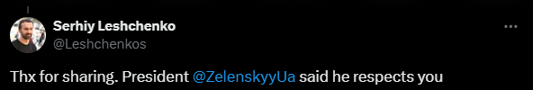 "Спасибо, что распространили. Президент Зеленский заявил, что уважает вас", - написал Лещенко Илону Маску.