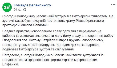 "Владимир Зеленский встретился с Патриархом Филаретом. На встрече также присутствовал настоятель храма Рождества Христова протоиерей Николай Салабай", - говорится в заявлении.
