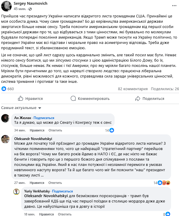 "Нужен очень продуманный текст, со сбалансированной эмоцией. Это не означает, что это письмо сразу что-то кардинально изменит, но такой посыл должен быть. Нет никакого смысла бояться, что мы испортим отношения с этой администрацией Белого Дома, потому что их, отношений, больше нет. Как нет и той Америки, о которой мечтали много поколений нашей планеты", - подчеркнул Наумович.