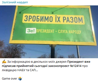 "По информации в нескольких моих источниках, Президент уже подписал принятый сегодня законопроект №12414 о ликвидации НАБУ и САП…", – говорится в сообщении.