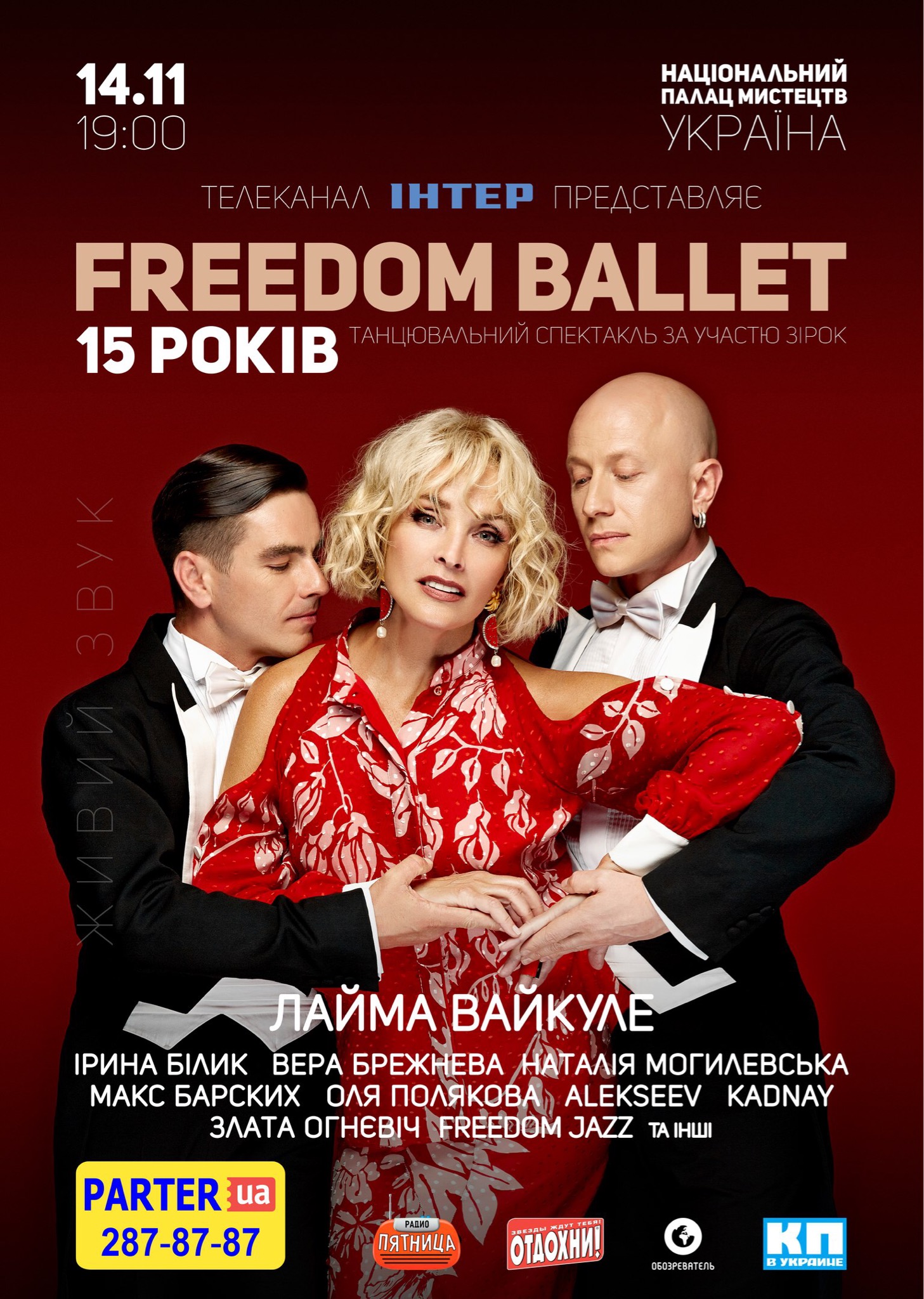 14 ноября на сцене Дворца Украина FREEDOM BALLET с 15-летним юбилеем своими суперхитами поздравят: Вера Брежнева, Наталья Могилевская, Ирина Билык, Оля Полякова, FREEDOM JAZZ, ALEKSEEV, Злата Огневич, KADNAY, Макс Барских, премьеры Национальной оперы Украины - Екатерина Кухар и Александр Стоянов, а также виртуоз-оркестр KIEV TANGO PROJECT. Главной приглашенной звездой станет несравненная Лайма Вайкуле.