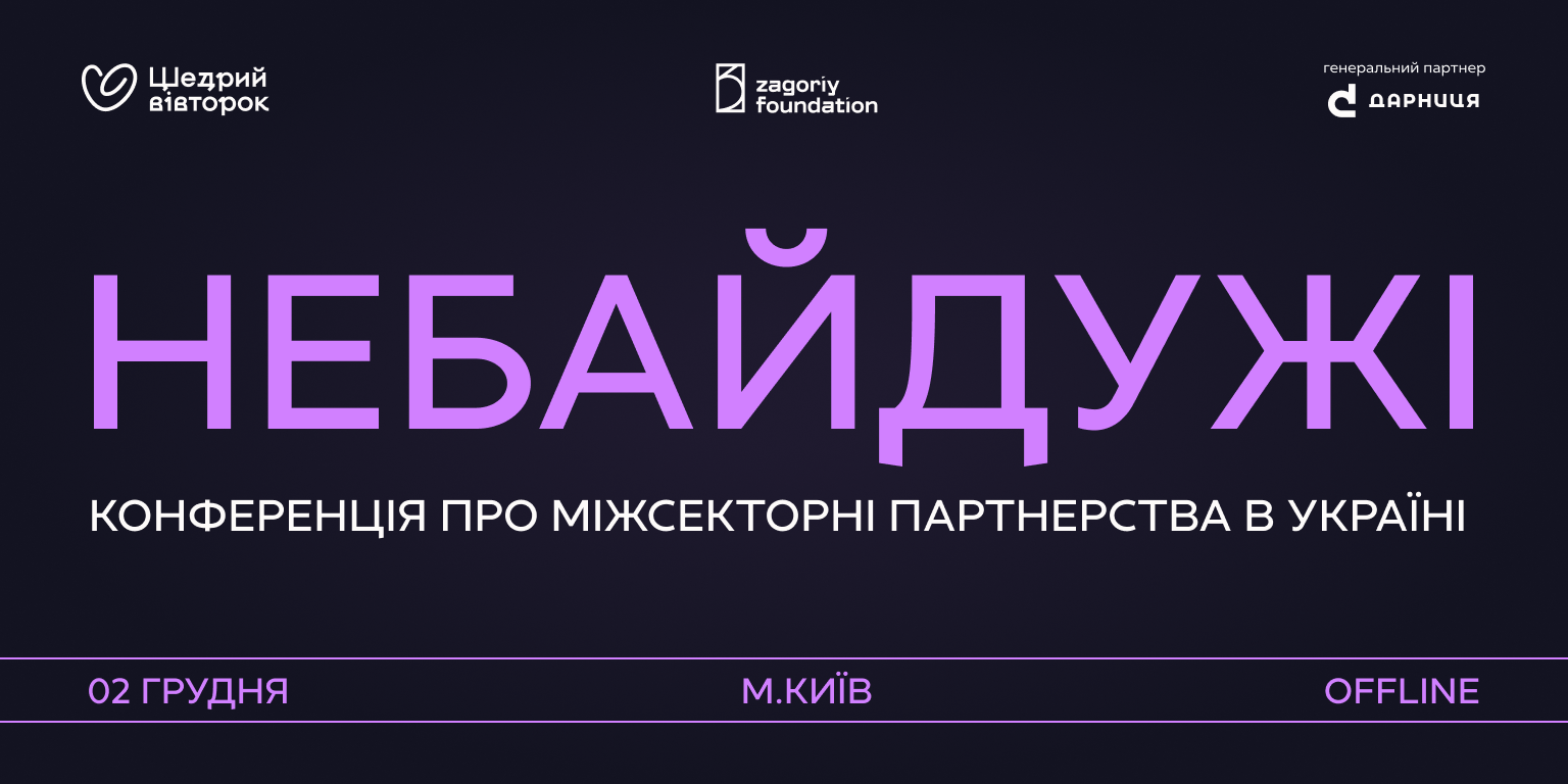 2 декабря конференция «Небайдужі: межсекторные партнерства в Украине» от «Щедрого вторника» – проекта Zagoriy Foundation – соберет представителей бизнеса, государства и гражданского сектора, чтобы честно поговорить о вызовах сотрудничества, поиске совместных решений и восстановлении доверия. Событие станет пространством для обмена опытом, создания новых партнерств и практических идей.