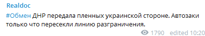 "ДНР передала пленных украинской стороне. Автозаки только что пересекли линию разграничения", - говорится в сообщении.