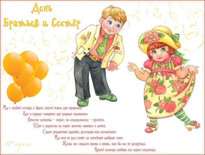 В субботу, 10 апреля, во многих странах мира отмечают День братьев и сестер. Хотя этот праздник еще не стал очень популярным, но это отличный повод, чтобы вспомнить о самых родных людях и обрадовать их поздравлением.
