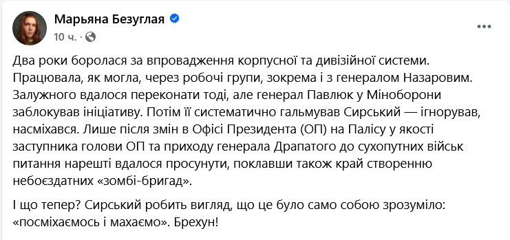 "Так вот, к сведению депутата Безуглой и кому интересно. концепция развития ВСУ, в основу которой положена корпусно-бригадная система, была готова еще в октябре 2024 года. Уже в ноябре она была готова к применению. С доказательствами все просто: в ноябре мы встречались с генералом Сырским и обсуждали ряд вопросов и это тоже. Поскольку главком не очень часто общается с мл. сержантом, я разговор записывал. Вопрос о создании дивизий задавали. Ответ был подробный - о корпусах. Которые будут созданы в ближайшее время. Точка".
