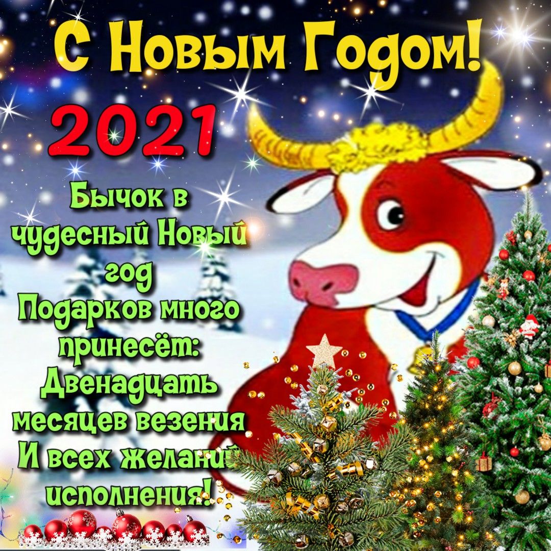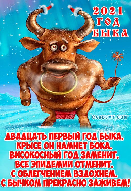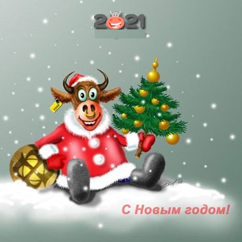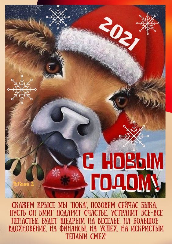 С 2021 Новым годом, с годом Быка! Пускай все лучшие качества этого сильного и красивого животного помогают вам прожить год успешно и ярко! Пусть все задачи решаются с космической скоростью, а ваши находчивость и оптимизм помогают строить грандиозные планы! С праздником!