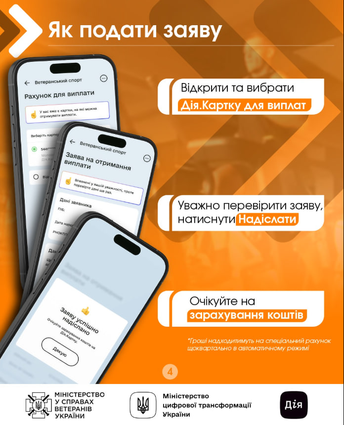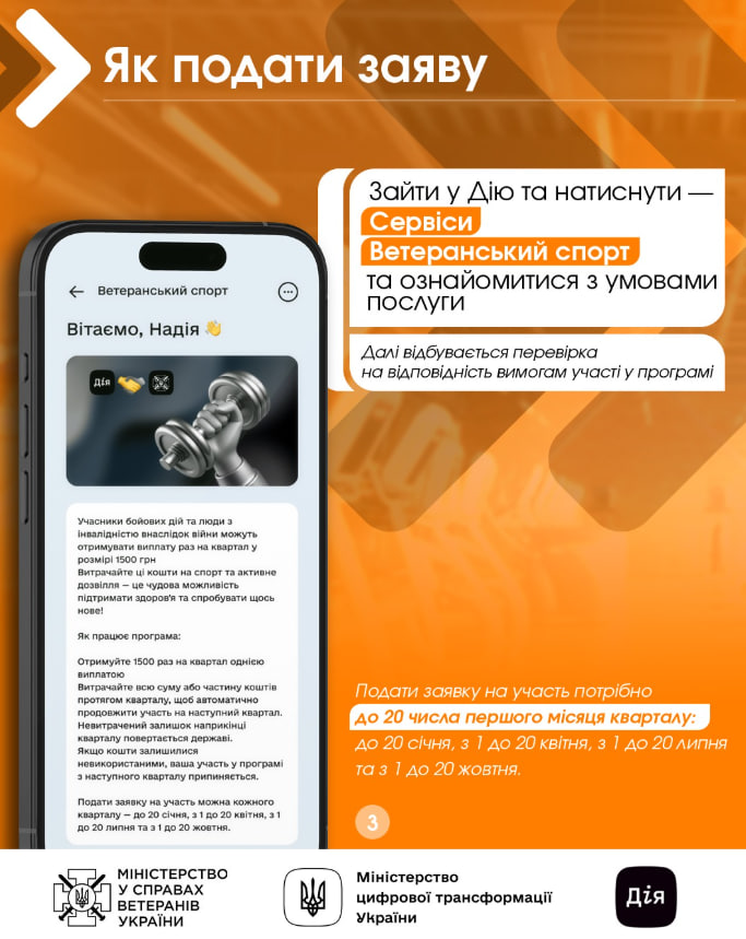 Стартовала программа в Министерстве ветеранов, по которой участники боевых действий и ветераны с инвалидностью в результате войны смогут ежеквартально получать по 1 500 грн для оплаты спортивных занятий Деньги будут поступать на специальный счет в автоматическом режиме.