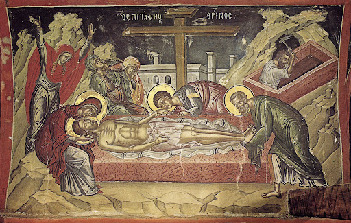 Истории из Евангелий, хотя о Великой субботе их немного, переносят верующих во время после распятия Иисуса Христа. Его тело было снято с креста и погребено во гробе, высеченном в скале. Праведный Иосиф Аримафейский вместе с Никодимом завернули тело в плащаницу с миром и положили в гробу, привалив ко входу большой камень.