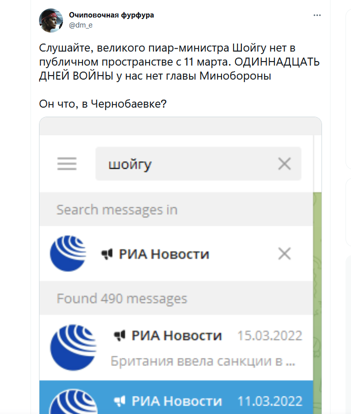 Примечательно, что последняя новость в профиле Шойгу на сайте Минобороны тоже датирована 11.03.2022 годом.
